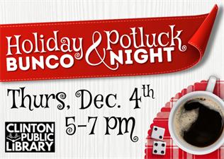 Please join us for a Holiday Bunco & Potluck Night! Bunco is an easy to learn dice game that is lighthearted and friendly. We will provide sloppy joes and a drink & attendees are welcome to bring a dish to pass. As this is also a potluck event and dishes will be prepared in personal kitchens, bring a printed copy of your recipe, ask questions if you have allergies, and eat at your own discretion. Please bring your own plate, cup & cutlery. Registration is required, please call (563) 242-8441 or register through our online calendar. Ages 14+.